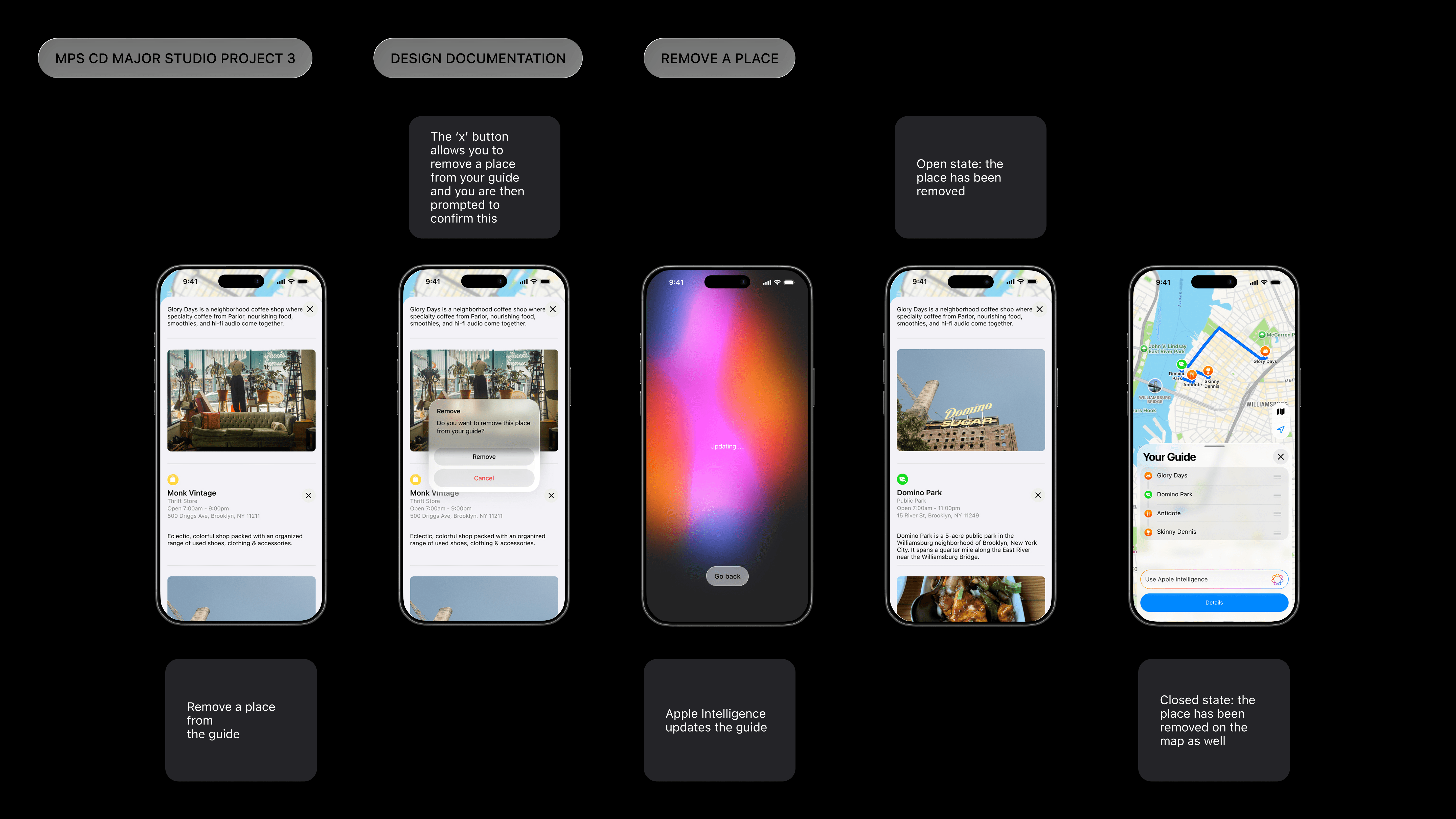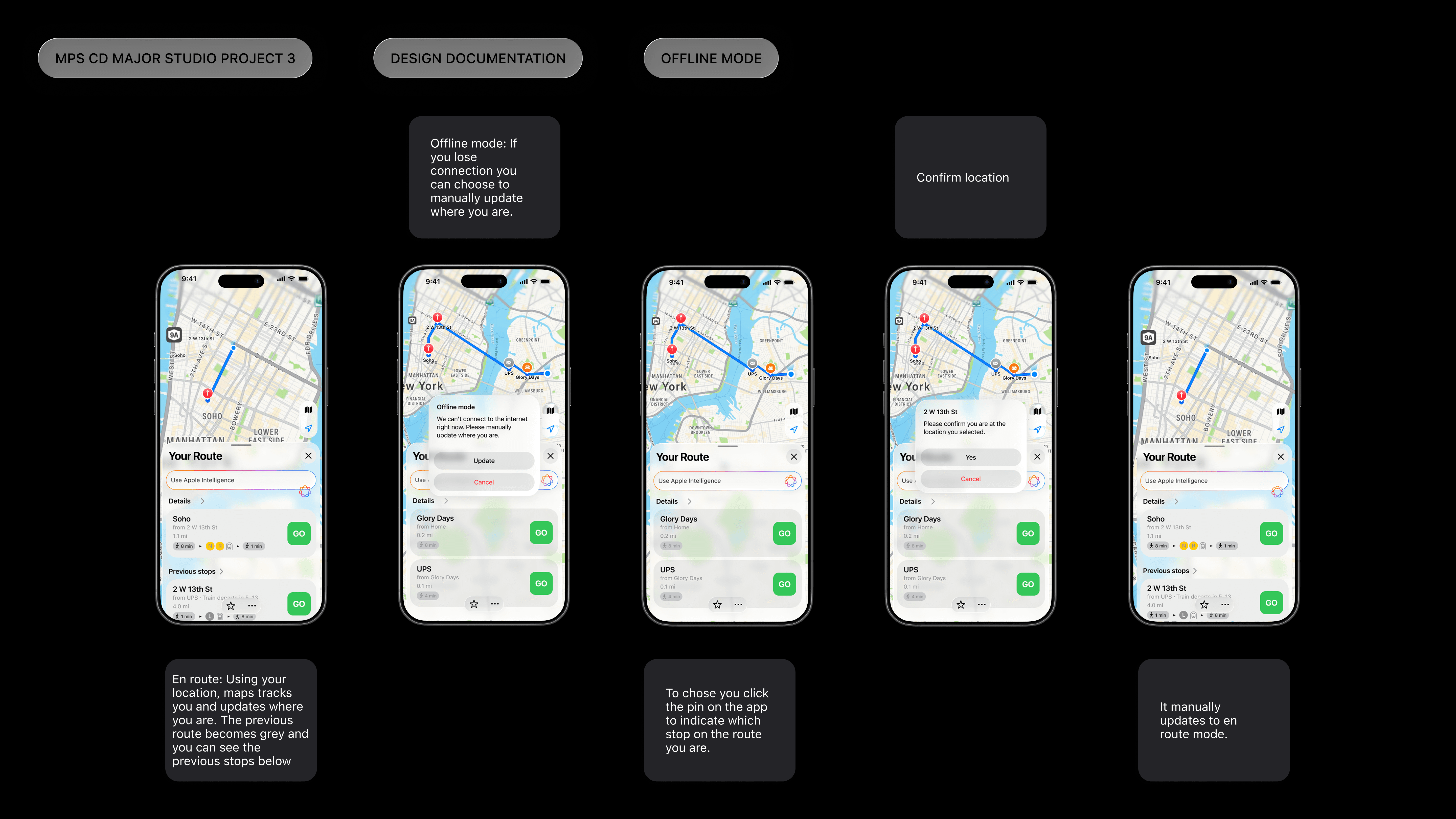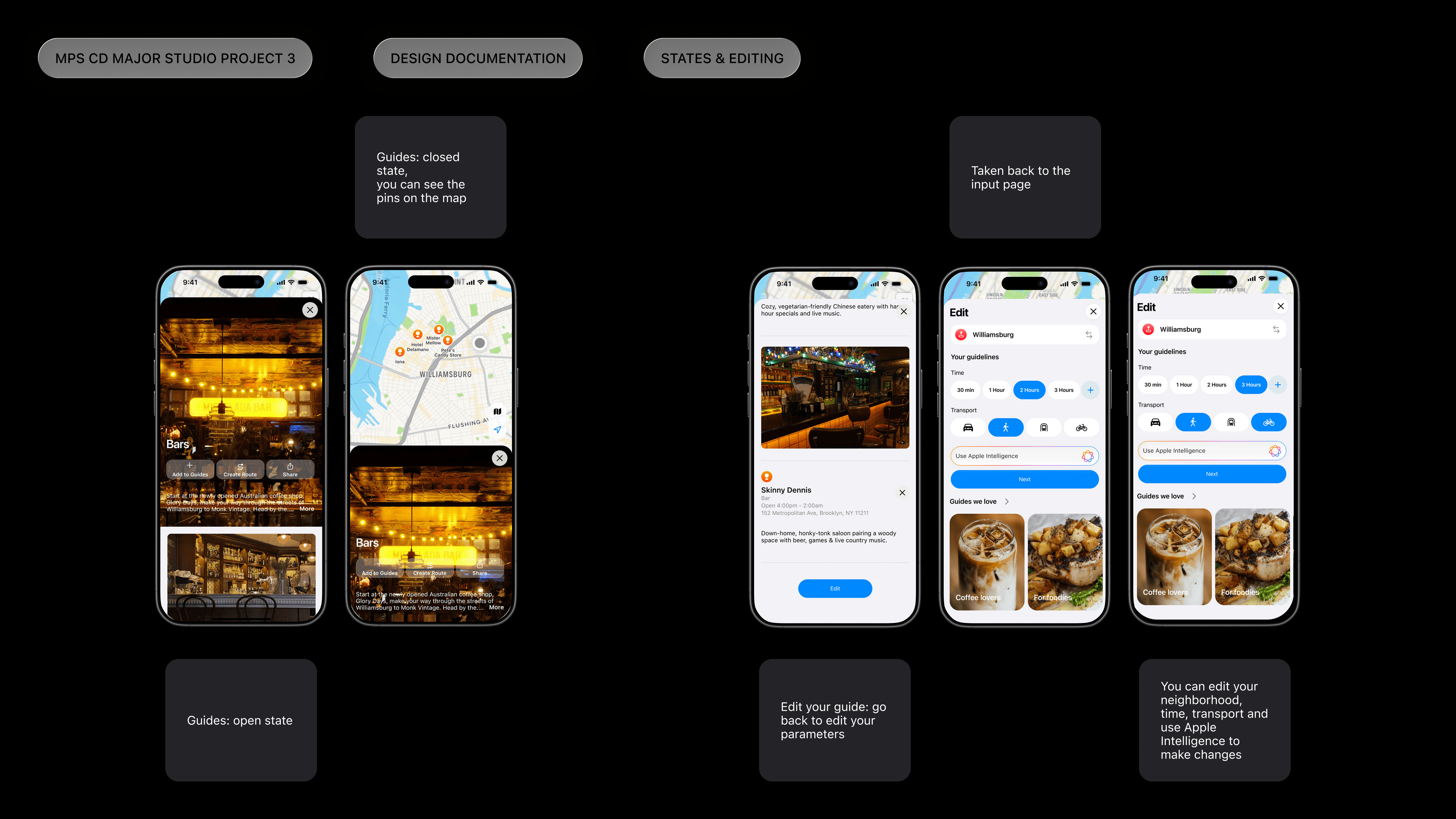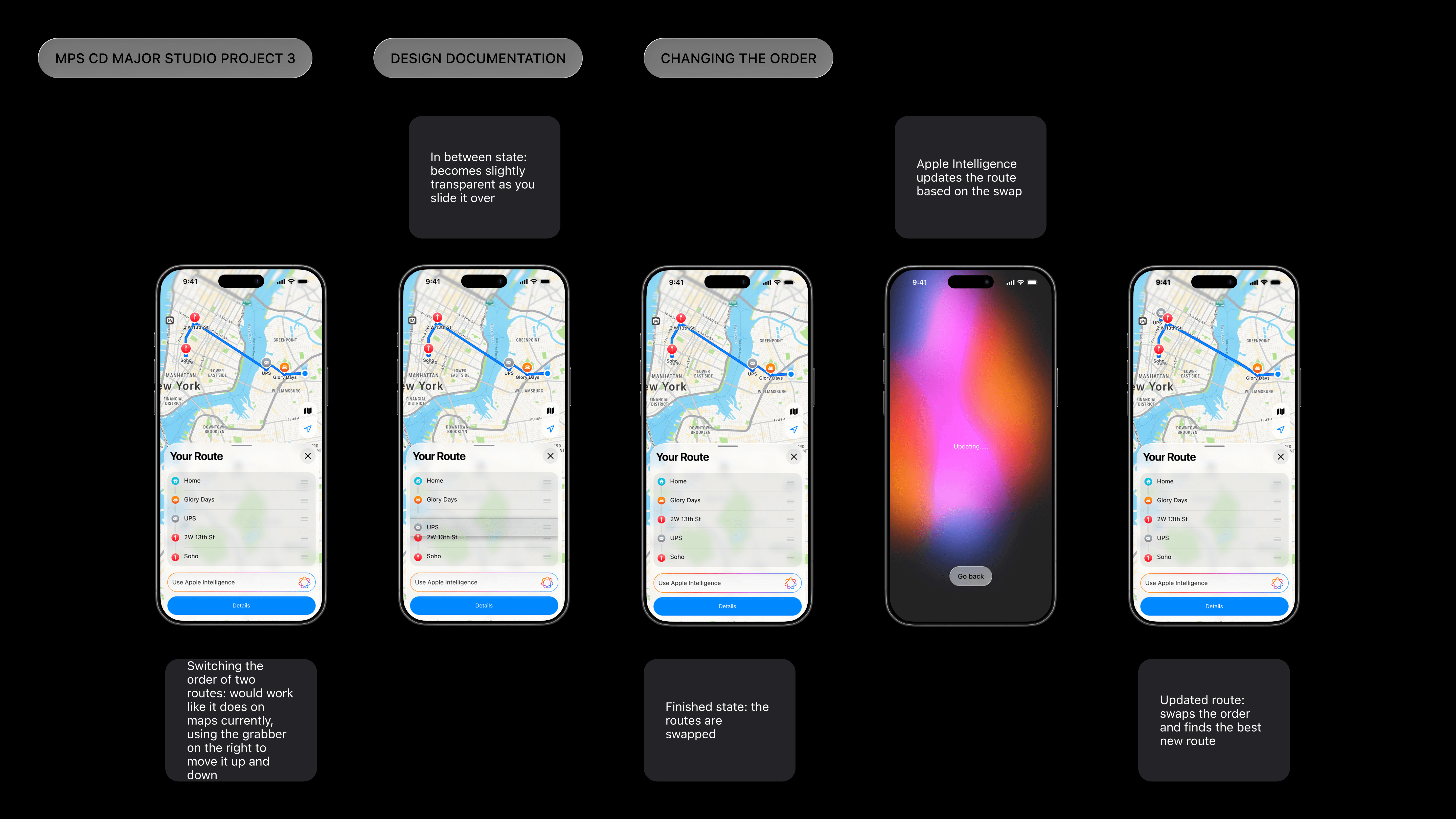 For this project, my goal was to explore adding features to an already existing app or product. As an avid apple maps user, I decided to explore how I could add a feature that would benefit its users and integrate seamlessly with existing features. After conducting an audit of the app and its competitors as well as a round of user interviews, I created conceptual prototypes. Testing these prototypes lead me to create my two features: a bespoke route builder and an explore neighborhoods tool. As Apple Intelligence has become a large part of iOS26, I wanted my features to integrate AI, allowing them to be smart and responsive. After rounds of lo and mid-fi prototypes, I created two high-fidelity flows using Apple’s iOS 26 design system. I also focused on design documentation, where I focused on other edge cases and states.