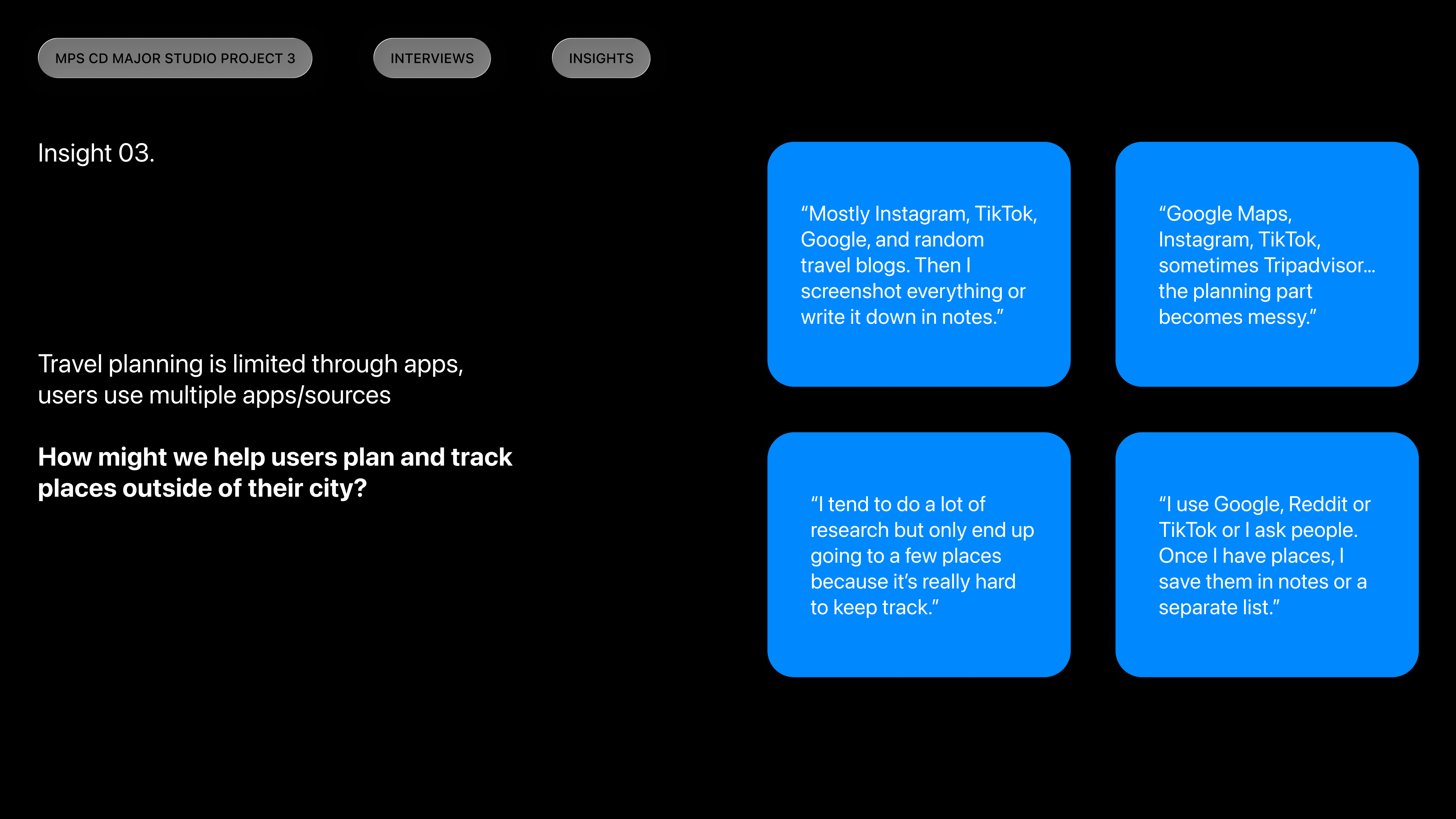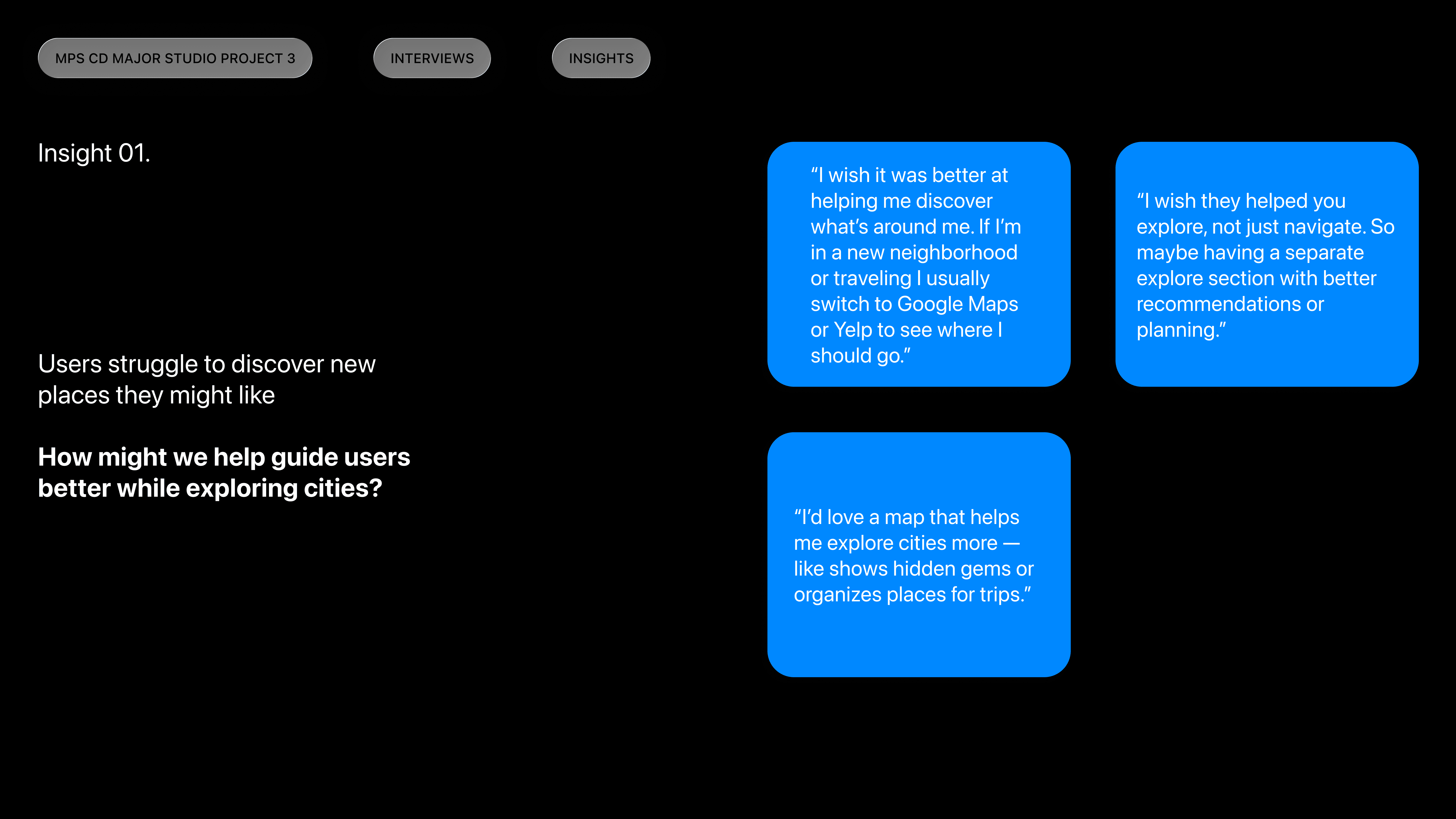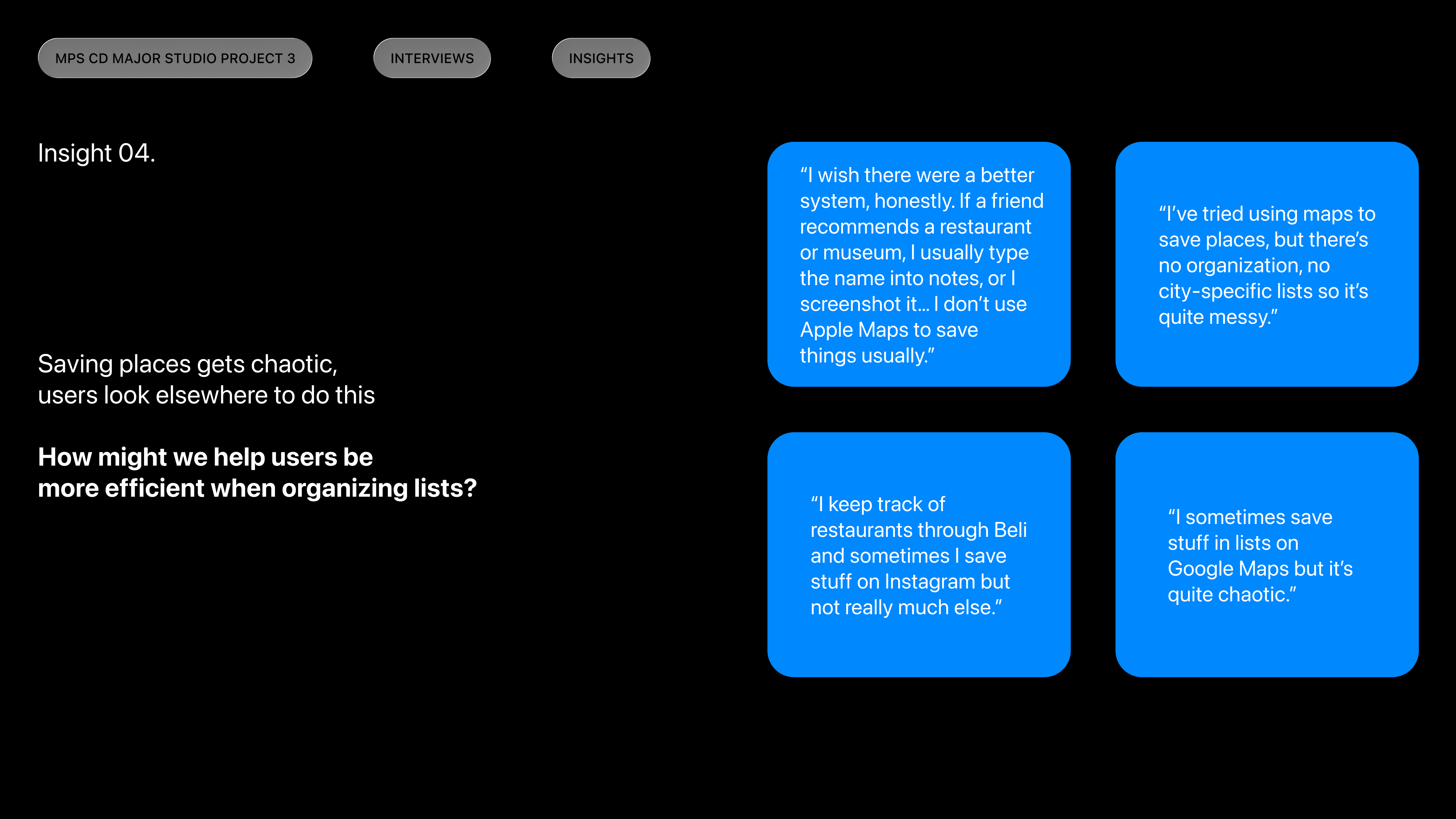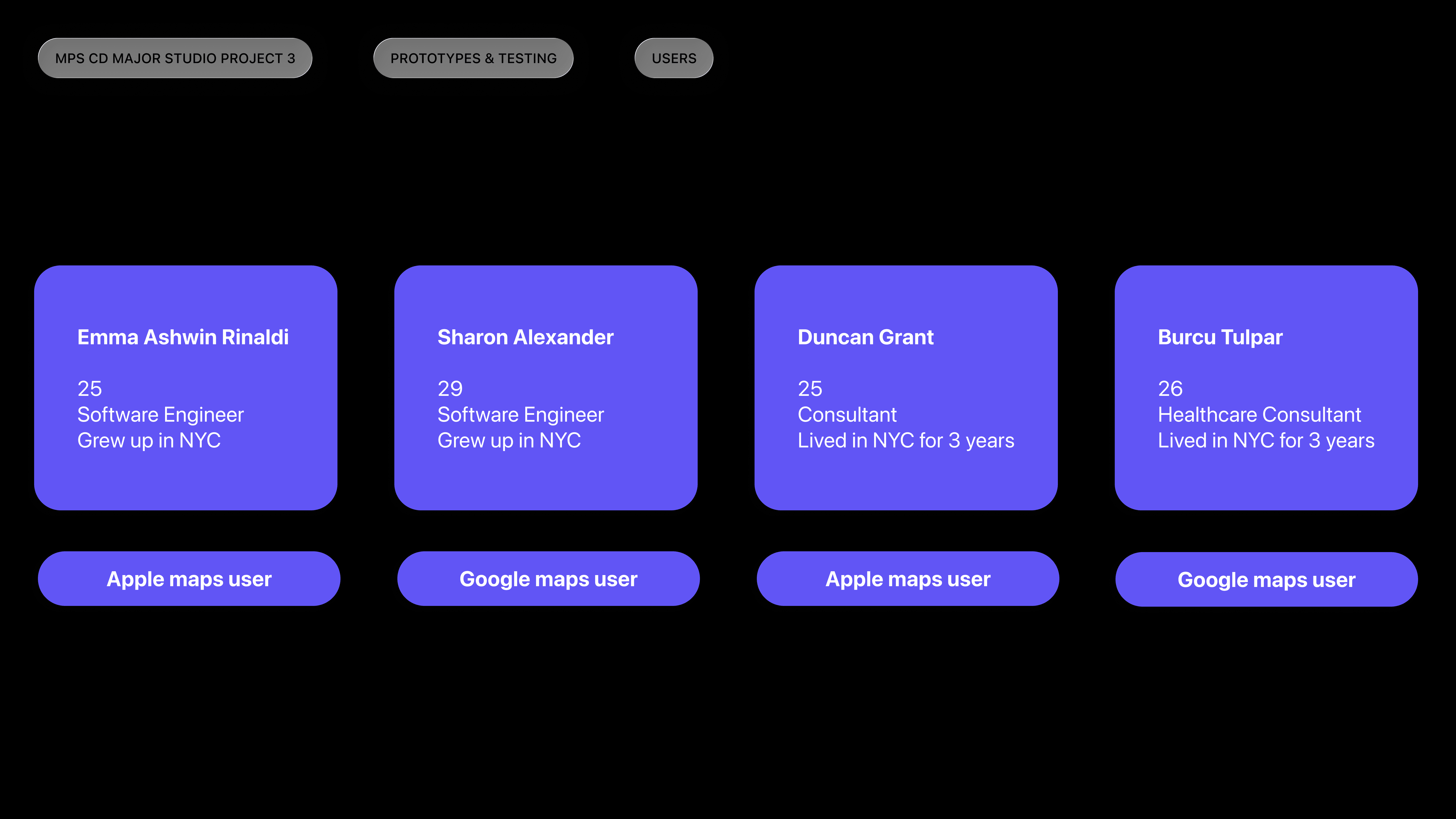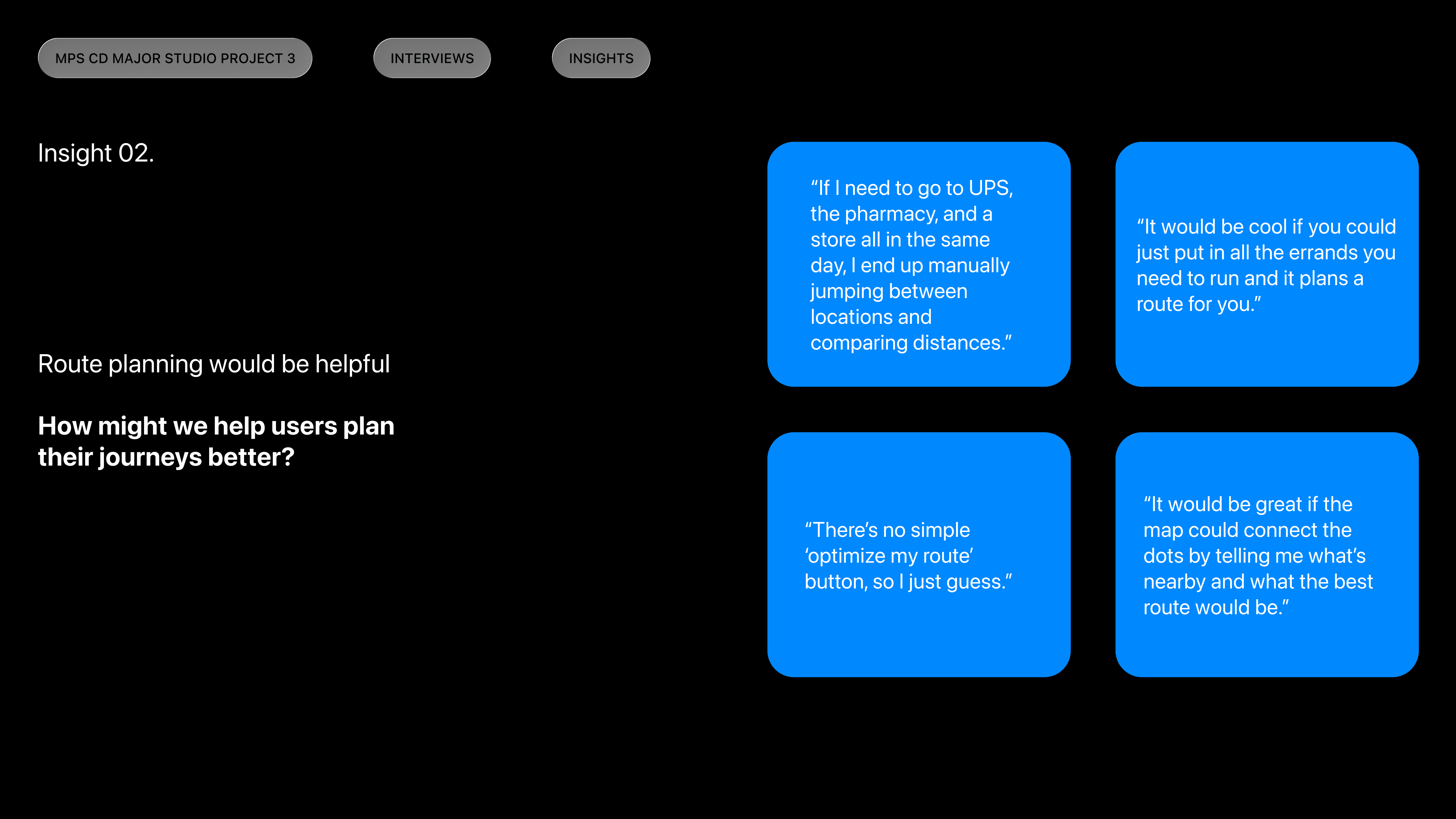 I conducted interviews with both Google Maps and Apple maps users and synthesized my research into the following key findings: