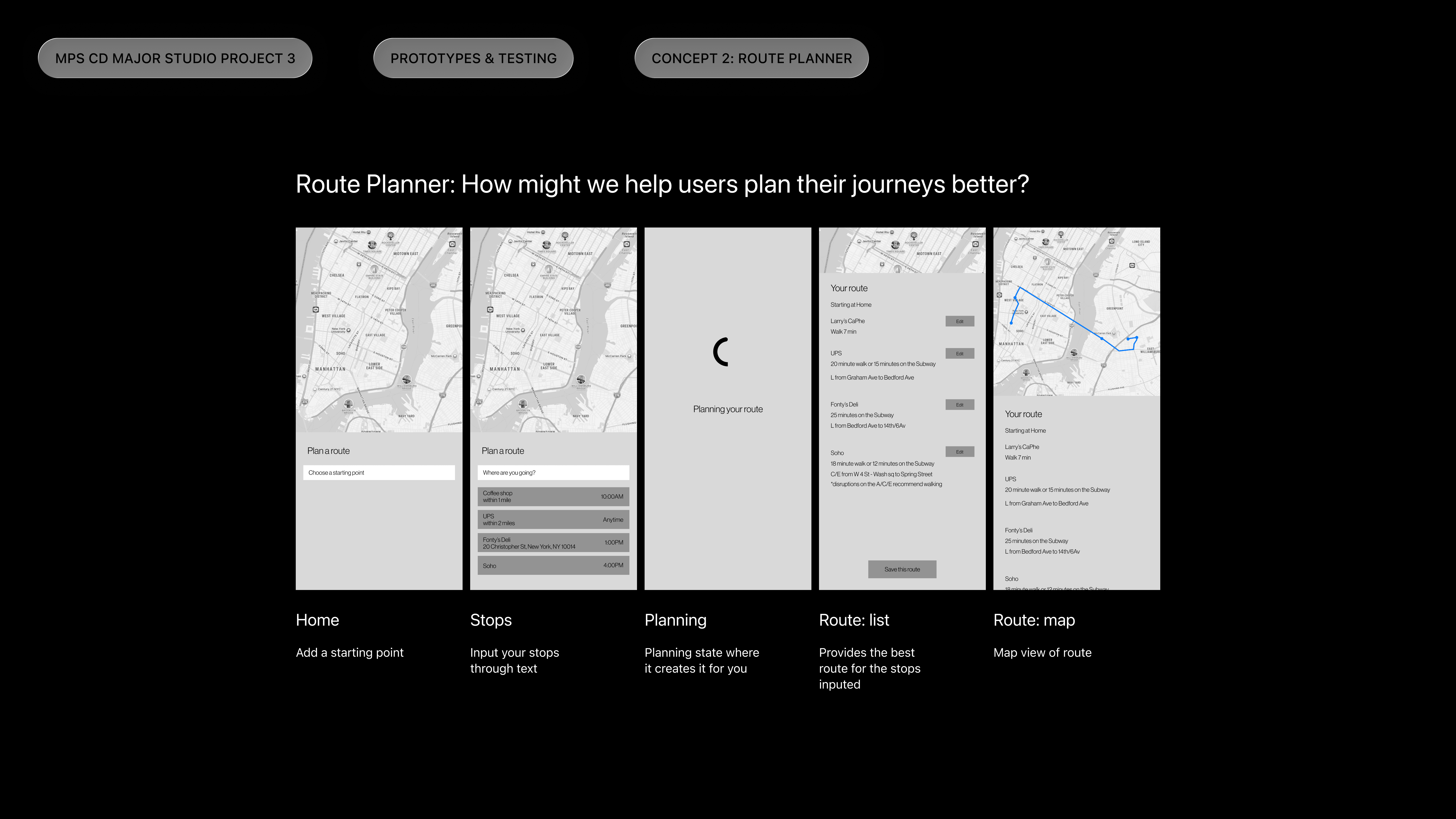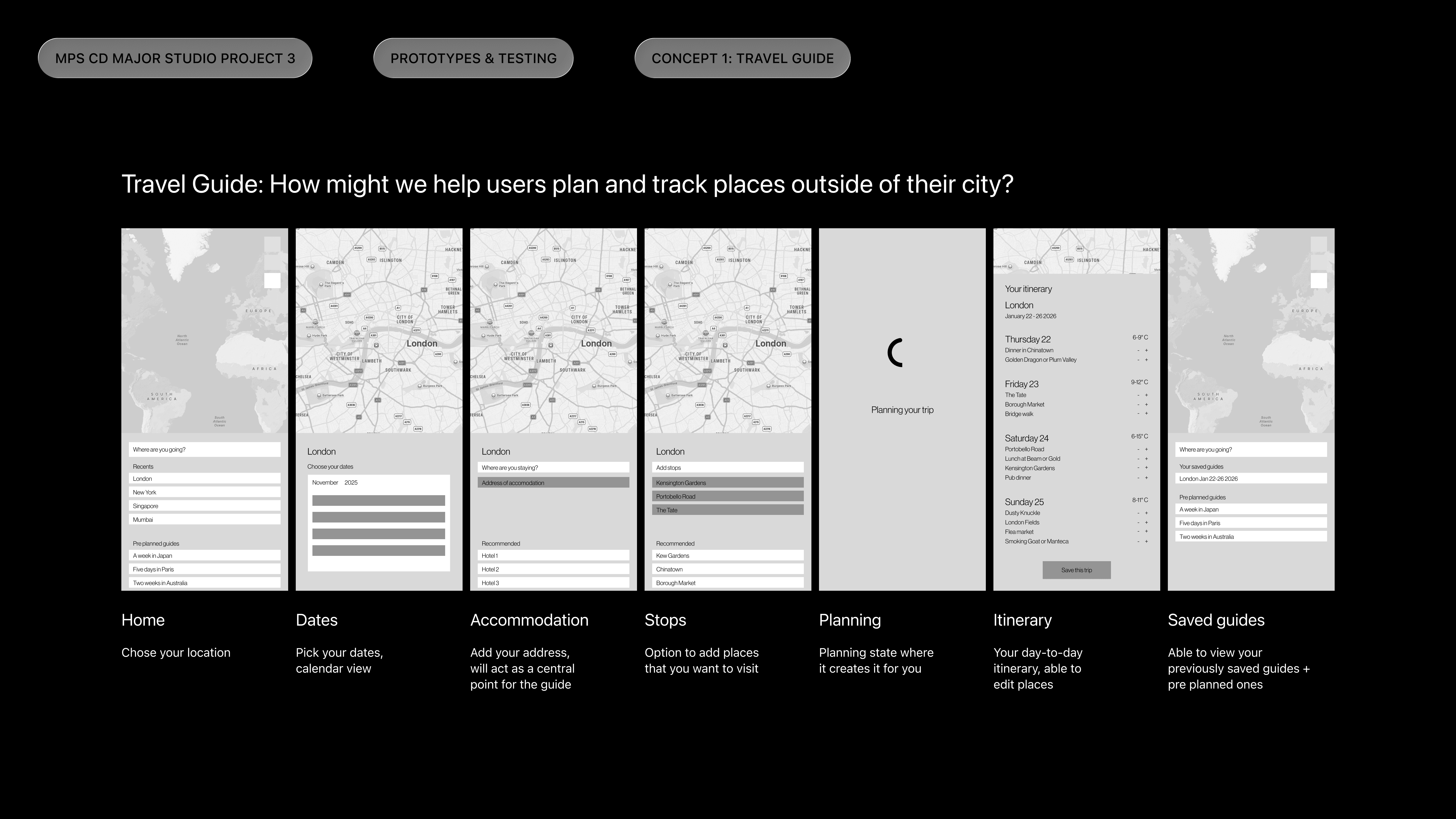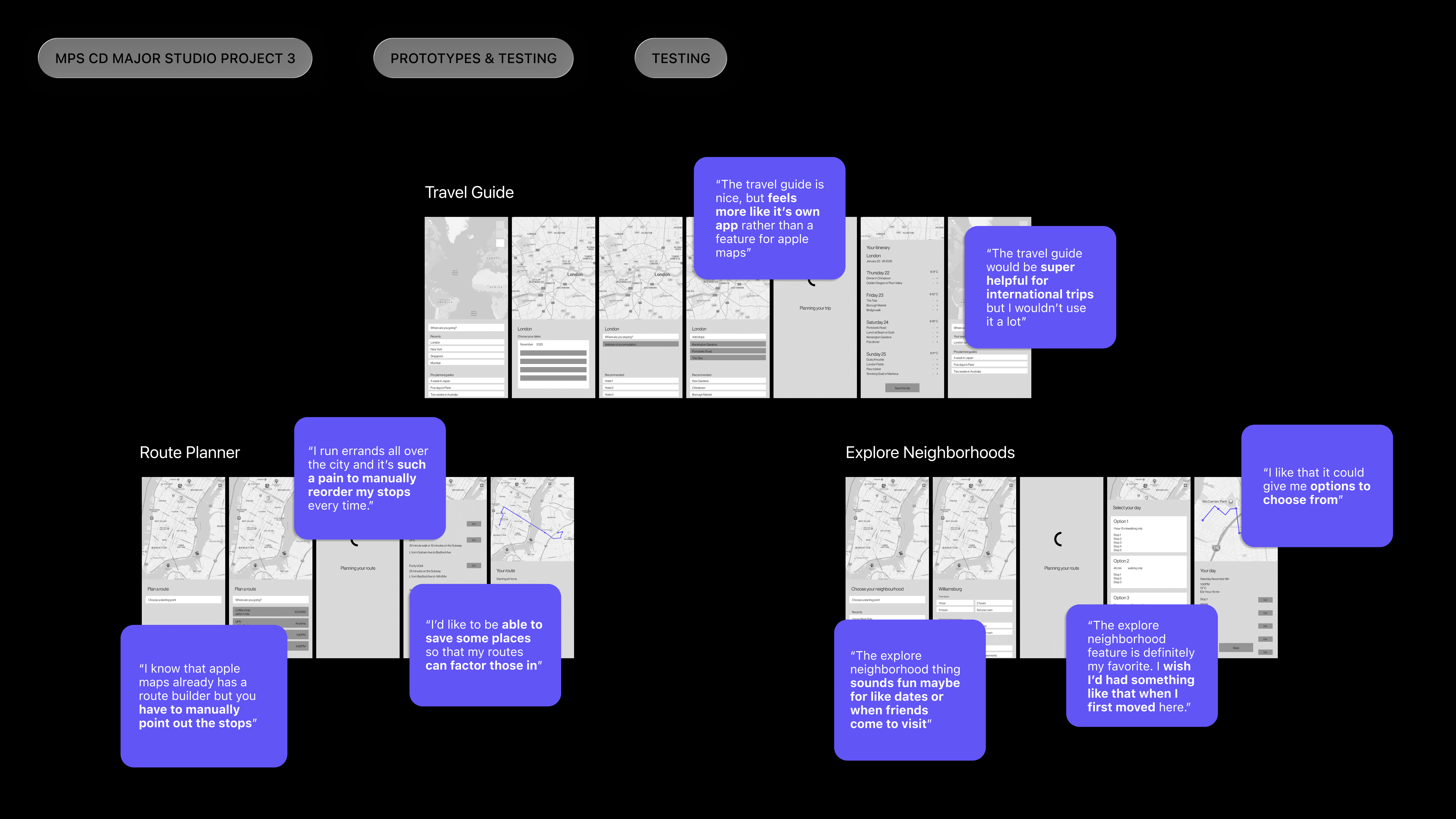 Based on research insights, I began sketching initial concept prototypes exploring three different features: a travel guide, bespoke route planner and an explore neighborhoods tool.